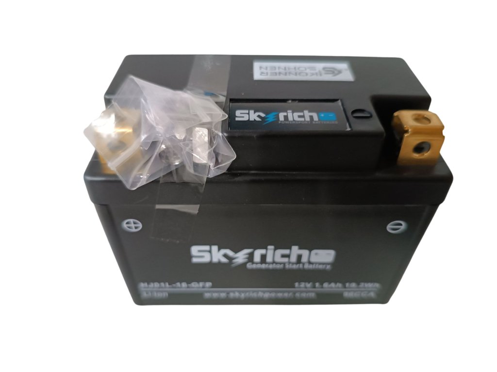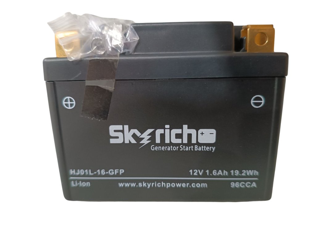 Lehká Li-Ion autobaterie Skyrich HJ01L-16-GFP s napětím 12 V, kapacitou 1,6 Ah (19,2 Wh) a startovacím proudem 96 CCA. Ideální pro elektrocentrály a malé stroje, kde je vyžadován spolehlivý start a nízká hmotnost.