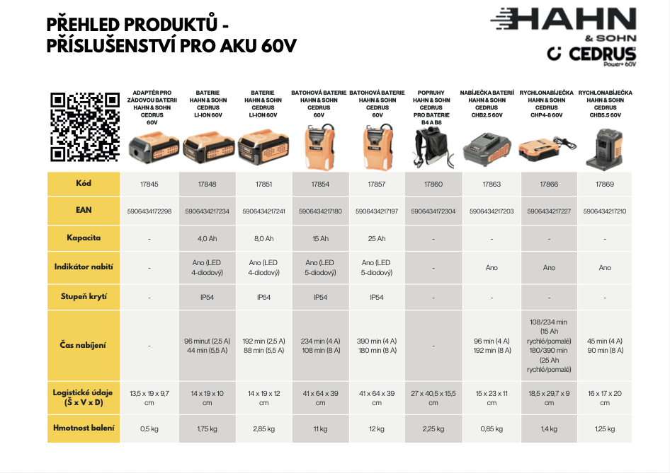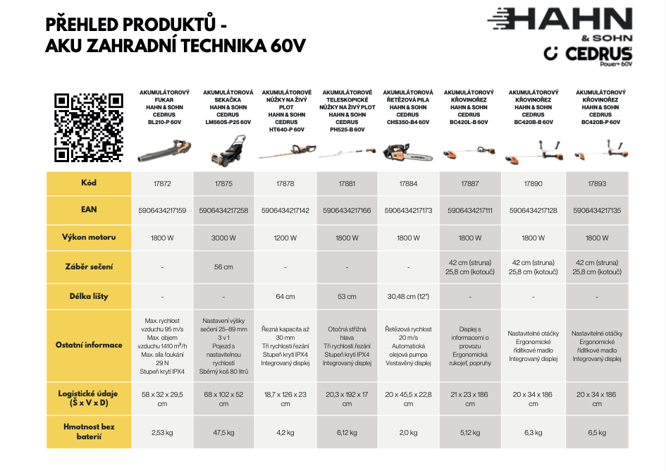 Představujeme vám novou generaci akumulátorové zahradní techniky Hahn & Sohn Cedrus, která pracuje na výkonném 60V systému. Tato řada je navržena tak, aby splnila požadavky moderní údržby zahrad, sadů, zeleně i komunálních ploch – a to bez hluku, výfukových plynů a složité údržby.