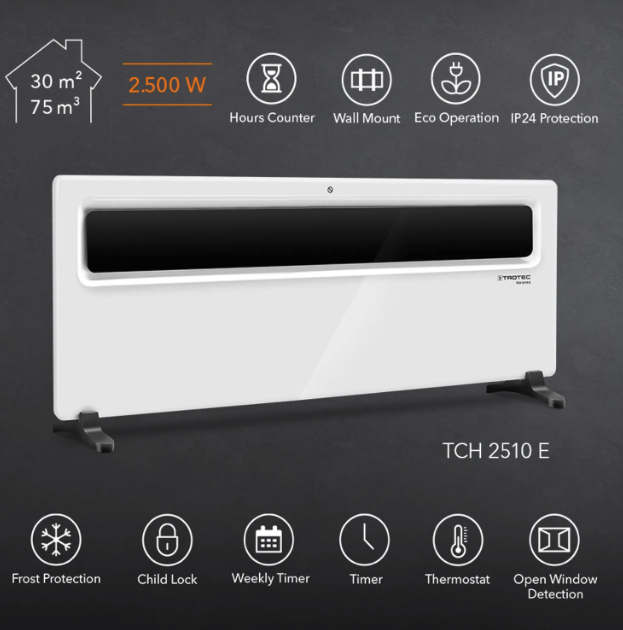 Stylový a výkonný konvektor TCH 2510 E s výkonem 2,5 kW poskytuje rychlé a efektivní vytápění místností do 30 m². Je vybaven moderními funkcemi, včetně týdenního časovače, detekce otevřeného okna a ochrany proti přehřátí.