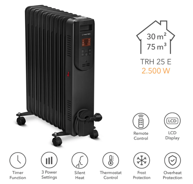 Olejový radiátor TRH 25 E nabízí efektivní a dlouhotrvající vytápění díky topným výkonům až 2500 W, třem stupňům výkonu a integrovaným bezpečnostním funkcím.