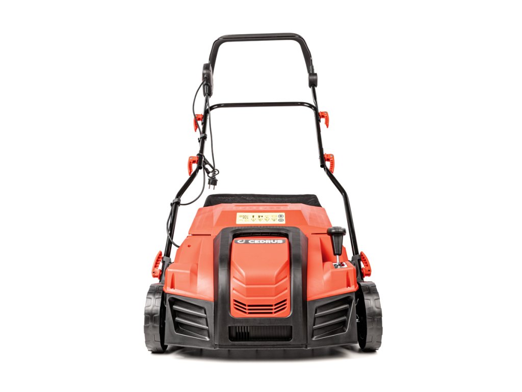 Výkonný elektrický vertikutátor Cedrus CEDWE40 s šířkou záběru 40 cm, centrálním nastavením hloubky vertikutace a sběrným košem o objemu 55 litrů. Ideální pro efektivní provzdušnění a regeneraci trávníku.