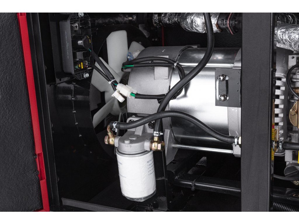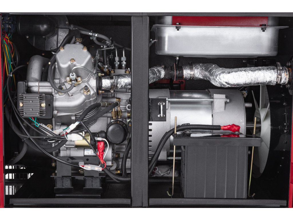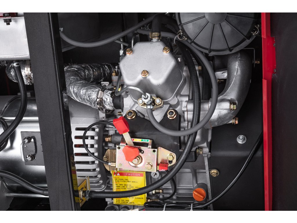 The HDE14000 generator can be operated in single-phase or three-phase mode. It then supplies either 230V (single-phase) or 400V (three-phase). The resulting power is either 10KW/10KVA at 230V and 10KW/12.5KVA at 400V (nominal power) or 11KW/11KVA at 230V and 11KW/13.75KVA at 400V (max. power). The control panel ensures easy switching between modes. The power generator is therefore an all-rounder and can be used at home, in the holiday home, as well as on construction sites or in the company.