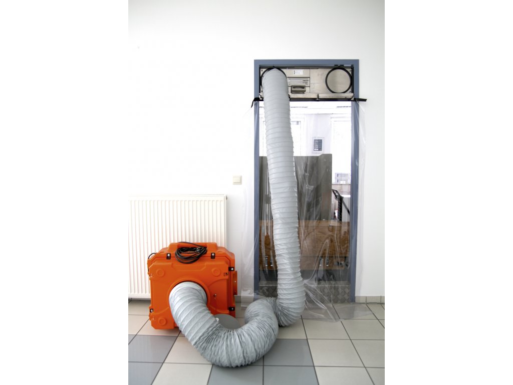 The HEYLO DCS-FT 500 dust suppression system quickly and safely removes dust from the work area and protects other living areas of the building from contamination. The complete system includes dust door DCD-3.0, air cleaner FT 500, air cleaner FT 500 + coarse air filter (G4) + fine dust filter (F9/class M)/optional HEPA filter (H14/class H) + hose (length 7.6 m) + hose adapter. Suitable for door widths up to 680 to 830 mm.