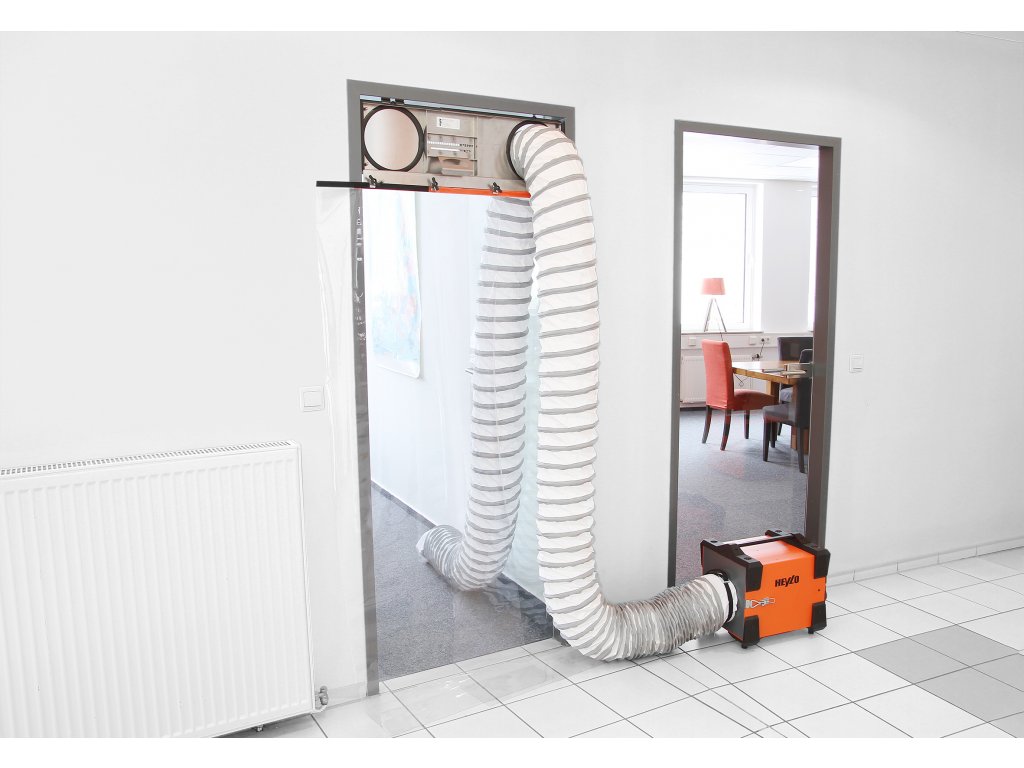 The HEYLO DCS-PF 1000 dust suppression system quickly and safely removes dust from the work area and protects other living areas of the building from contamination. The complete system comprises dust-tight door DCD-3.0, air cleaner PF 1000, + coarse air filter + fine dust filter (F9/class M)/optional HEPA filter (H14/class H) + ducting (length 7.6 m). Suitable for door widths up to 680 to 830 mm.