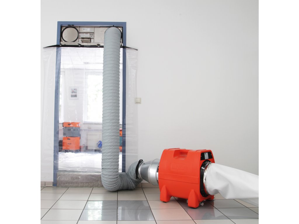 The HEYLO DCS-PV 3000 dust suppression system quickly and safely removes dust from the work area and protects other living areas of the building from contamination. The complete system includes the DCD-3.0 dust-tight door, PowerVent 3000 fan, dust bag class M, fixing clamp, air duct including fixing tape and duct adapter. Suitable for door widths up to 680 to 830 mm.