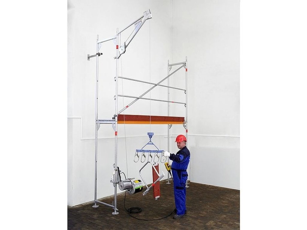 Stavební vrátek GEDA MAXI 120 S je navržen pro efektivní a bezpečný transport stavebních materiálů na stavbách. Díky rychlé montáži a snadné přemístitelnosti je ideální volbou pro různé fáze výstavby. Pohon vrátku se upevňuje dole na lešení, zatímco lehké otočné rameno je připevněno v požadované výšce nahoře. Tento systém umožňuje jednoduché přesuny vrátku podle aktuálních potřeb stavby. Ovládání je realizováno pomocí zásuvného ovladače s tlačítkem nouzového vypnutí, což zajišťuje bezpečný provoz.