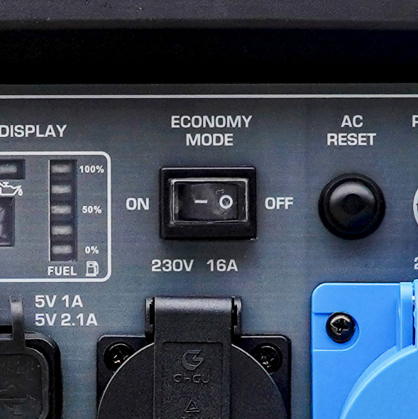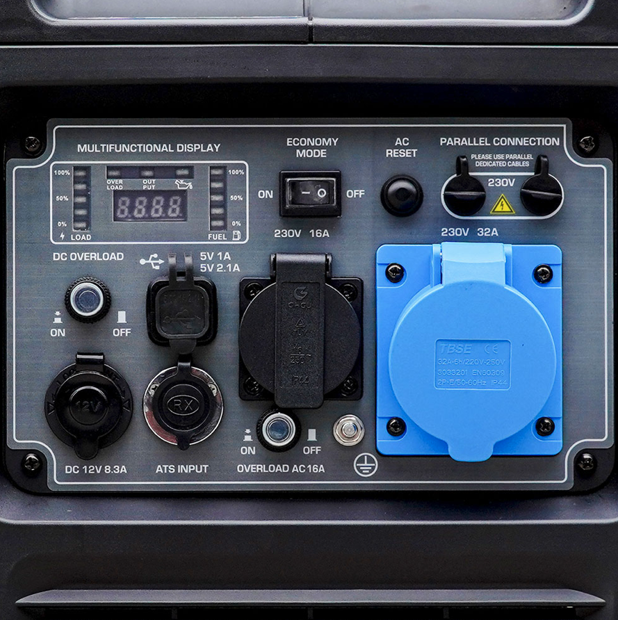 Pohodlné umístění všech funkcí: indikátory stavu generátoru, které signalizují provozní režim, automatické vypnutí při přetížení nebo zkratu, nízkou hladinu oleje, tlačítko Reset pro restartování řídicího systému a obnovení napájení, konektor pro paralelní připojení generátorů, typická zásuvka do auta 12V, která umožňuje připojení široké škály automobilových zařízení, gadgetů a nabíjení baterie, zásuvky 230V a zemnící svorka.