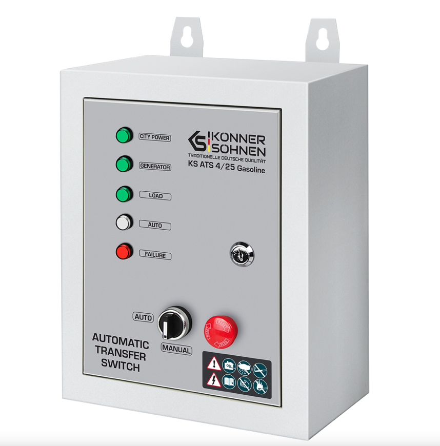 Generátor má možnost připojit systém ATS (automatický přenosový spínač). Jednotka automaticky spustí generátor a přepne zatížení na něj při odpojení hlavního napájecího zdroje a automaticky zastaví provoz generátoru při obnově centrálního napájení. ATS výstup má 8pinový připojovací konektor.