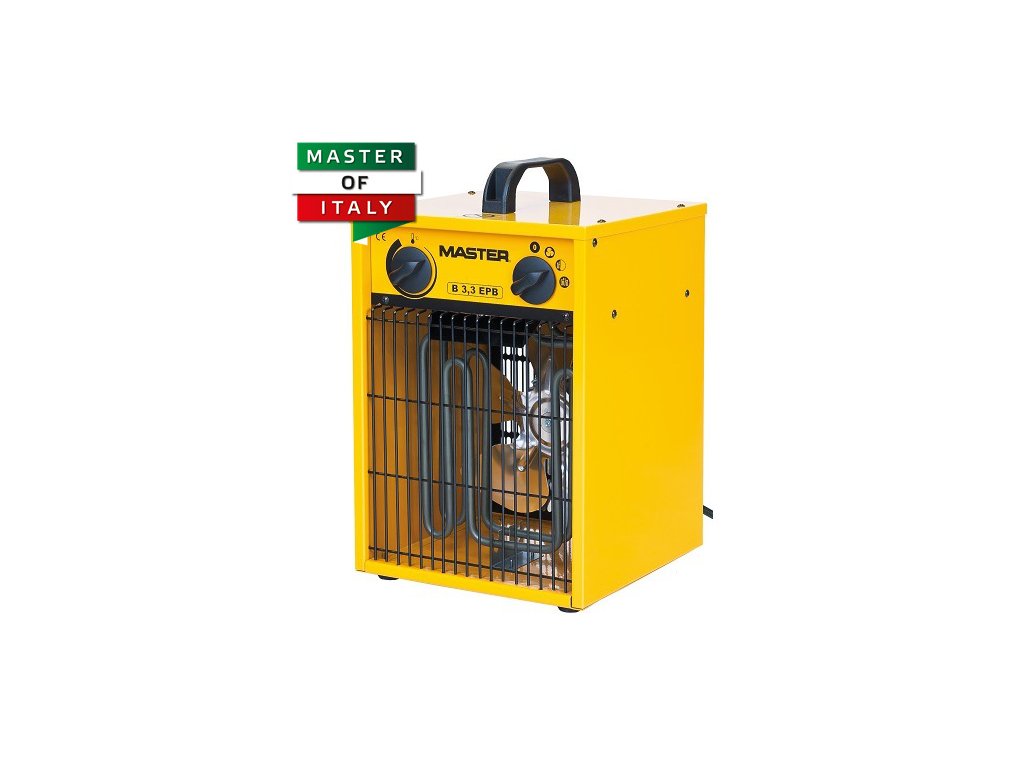 Elektrický přímotop Master B3,3 EPB je jedno z nejprodávanějších elektrických topidel vůbec. Master B3,3 EPB o výkonu 3,3 kW je nejsilnější elektrický ohřívač s připojením na běžnou zásuvku 230 V. Konstrukce topidla má díky robustnosti velmi dlouhou životnost. Topné prvky ohřívače jsou z nerezové oceli, motor je vybaven tepelnou ochranou a termostatem proti přehřátí.