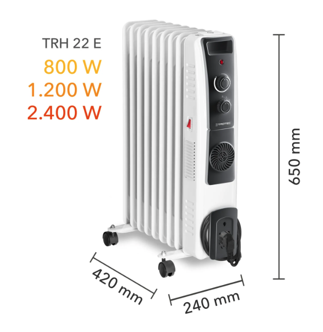 TRH 22 E je spolehlivý olejový radiátor vybavený 9 topnými žebry a třemi úrovněmi výkonu až do 2 400 W. Kombinace efektivního olejového topného systému a integrovaného ventilátoru zaručuje rychlý ohřev vzduchu v místnosti. Přístroj disponuje nastavitelným termostatem, ochranou proti přehřátí a převrácení, což zajišťuje bezpečný provoz.