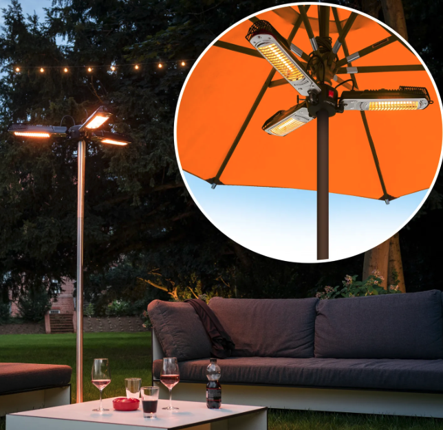 Tento infračervený ohřívač nabízí flexibilní možnosti instalace – lze jej použít jako volně stojící topidlo nebo připevnit k slunečníku.