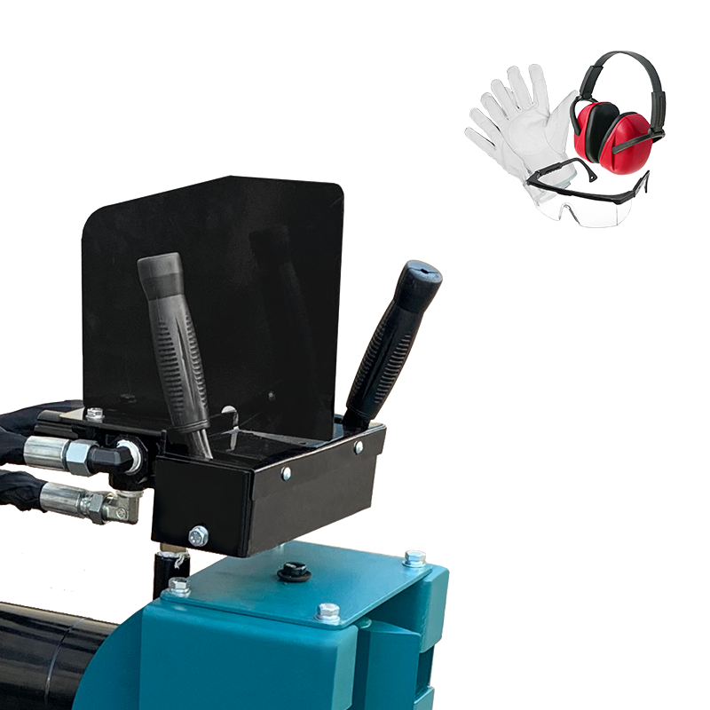Dvojpákový ovládací systém poskytuje zvýšenú bezpečnosť počas prevádzky. Každý štiepač dreva sa dodáva s polykarbonátovými okuliarmi, bezpečnostnými rukavicami a klapkami na uši.