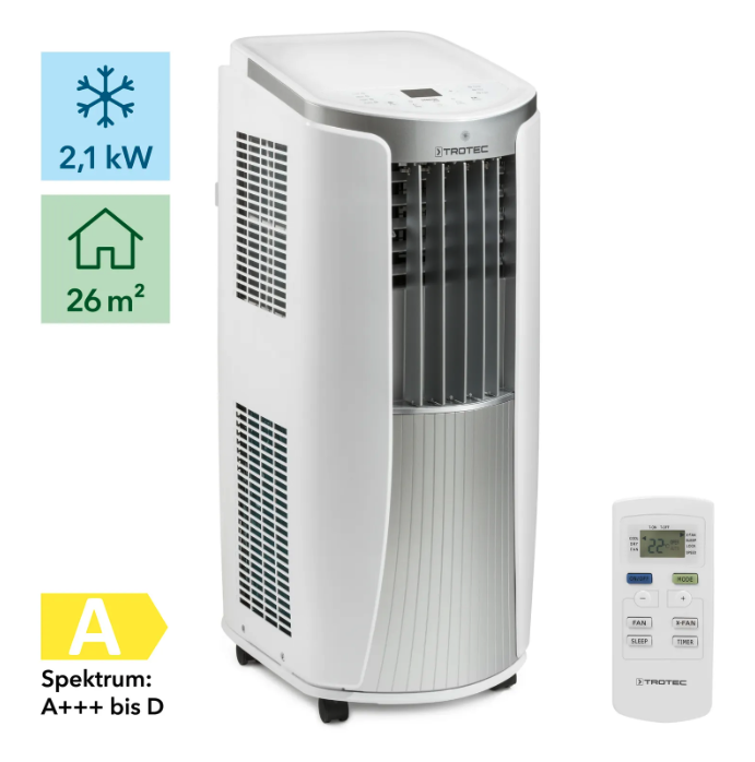 TROTEC PAC 2010 E je mobilní klimatizace určená pro chlazení, ventilaci a odvlhčování místností do 26 m². S chladicím výkonem 2,1 kW a energetickou třídou A poskytuje účinné chlazení při zachování nízké spotřeby energie.