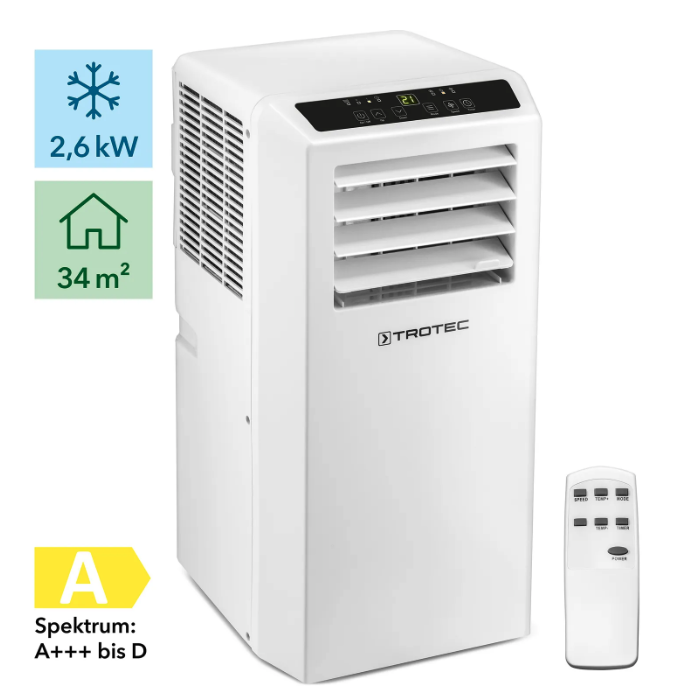 TROTEC PAC 2610 S je mobilní klimatizace s chladicím výkonem 2,6 kW (9 000 BTU/h), nabízející tři provozní režimy: chlazení, ventilaci a odvlhčování. Díky energetické třídě A a kompaktním rozměrům je ideální pro domácnosti i kanceláře.