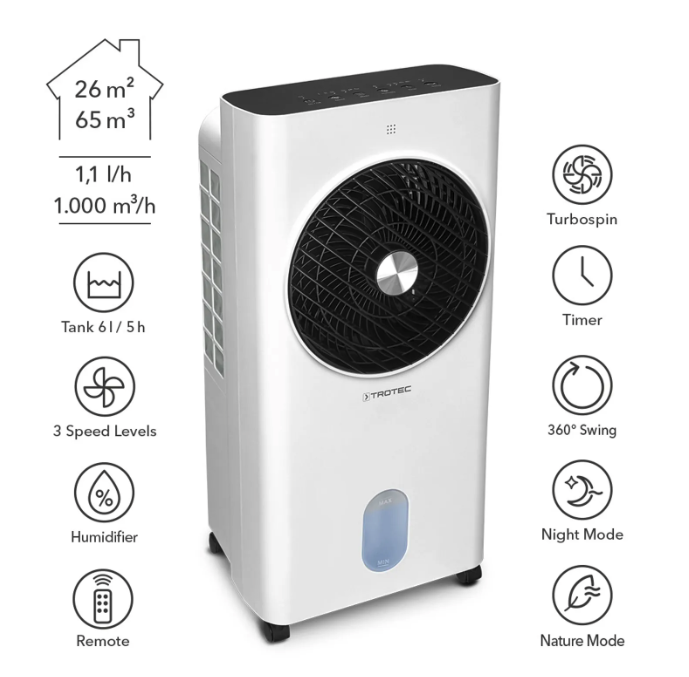 Trotec PAE 31 je navržen pro celoroční použití, poskytuje ochlazování během horkých letních dnů a zvlhčování vzduchu v zimních měsících. Zařízení využívá přirozený proces odpařování vody k ochlazení vzduchu, což zajišťuje ekologický provoz bez použití chemických chladiv. S výkonným Turbospin ventilátorem a třemi nastavitelnými rychlostmi ventilace lze snadno přizpůsobit výkon aktuálním potřebám. Funkce automatické oscilace lamel zajišťuje rovnoměrné rozložení chladného vzduchu v místnosti. PAE 31 je vybaven časovačem s možností nastavení až na 8 hodin a nočním režimem pro tichý provoz během spánku. Součástí balení je také dálkové ovládání pro maximální pohodlí uživatele.